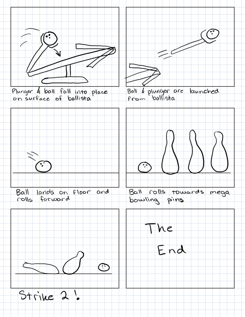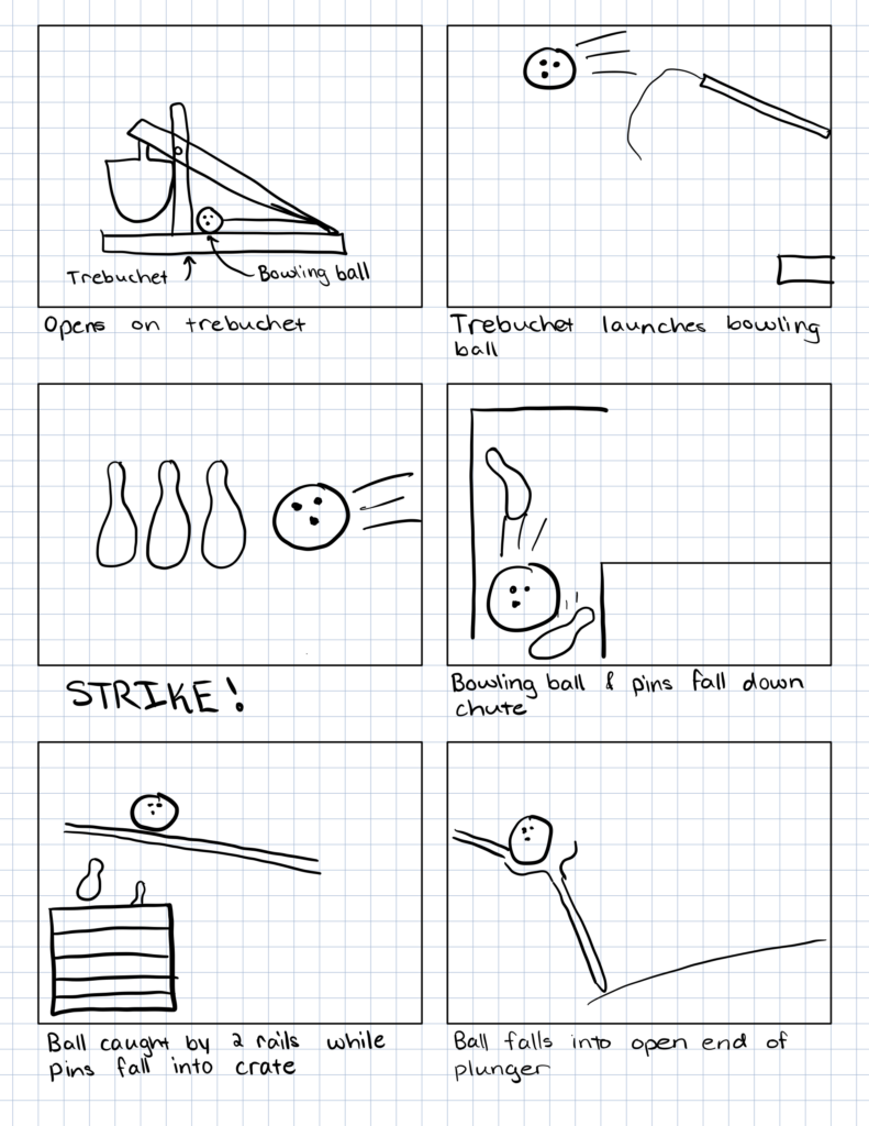 • The lower half of the Rube Goldberg machine goes a lot faster than it does in the final animation. This is because in the final animation I slowed it down in post-production in order to make the scene easier to follow since there’s a lot more camera movement in the 2nd scene.