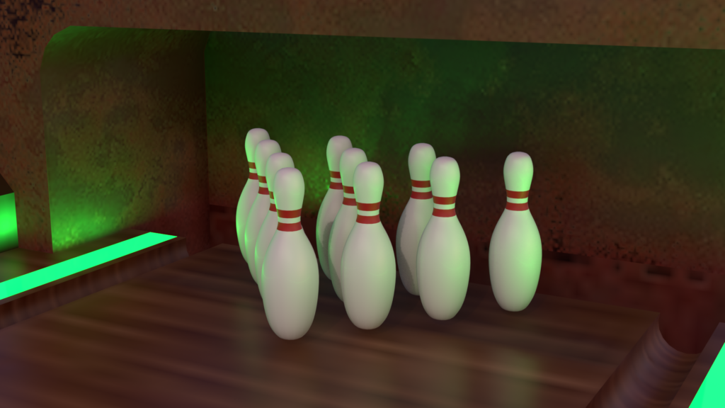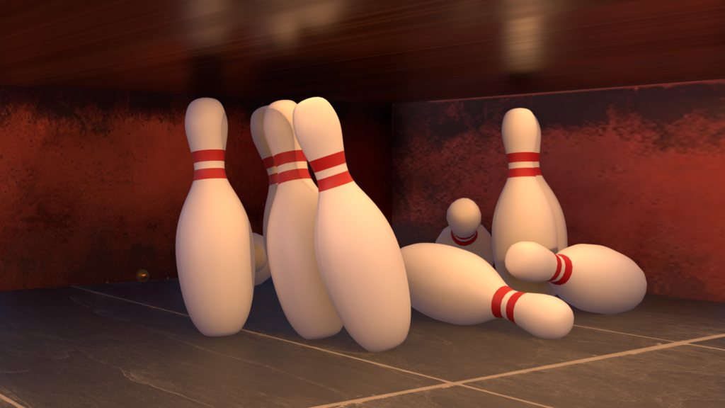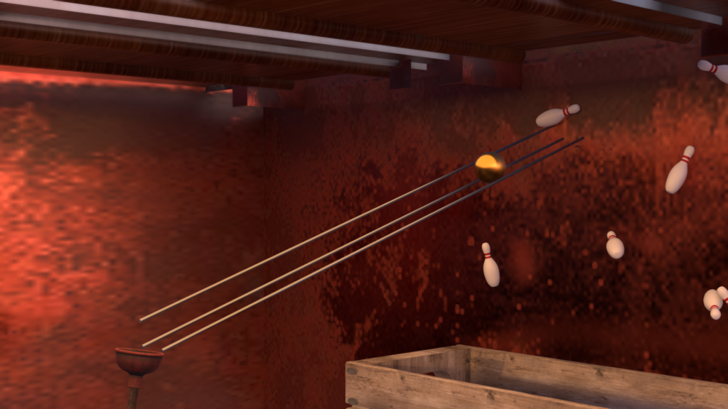 • A lot of the physics isn’t really as good as I make it seem in the final animation. For example, if you pay attention, you’ll see one of the small bowling pins slide to the right and eventually fall through the floor and land on the bottom floor. With the way I position the camera, you don’t see this in the actual animation. The plunger also goes a little crazy once it’s no longer in frame. The plunger was a really high-poly model, and I don’t think the physics engine liked that.