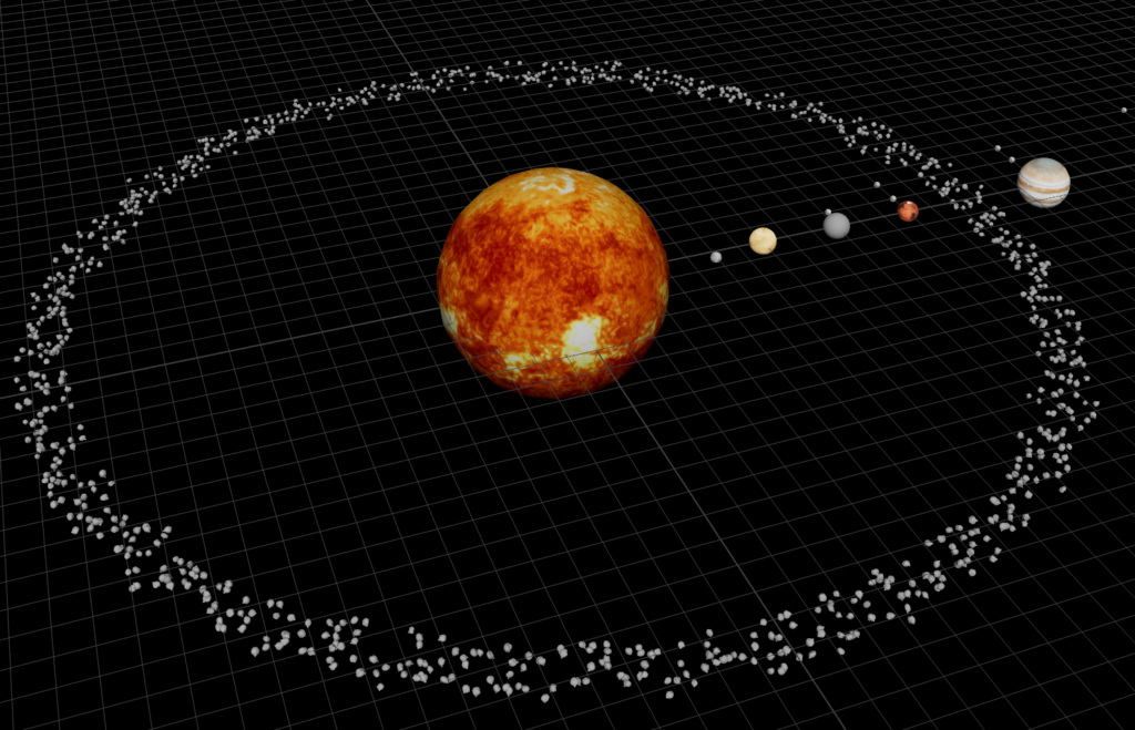 This initial version was created by following the textbook’s tutorial with a little extra research to make the planets’ orbits roughly match their actual orbital speed.