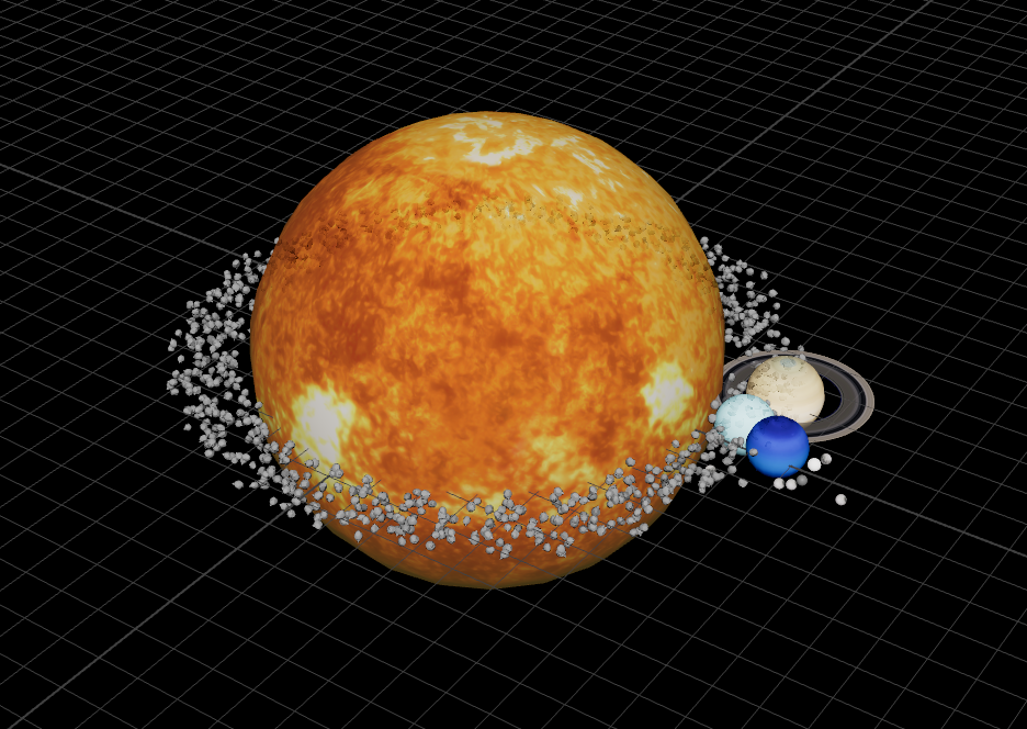 I used Maya’s MASH framework to create an asteroid belt in between Mars and Jupiter. The MASH framework allowed me to take one asteroid I created and make 1000 copies of it, each with randomly adjusted attributes and positions.