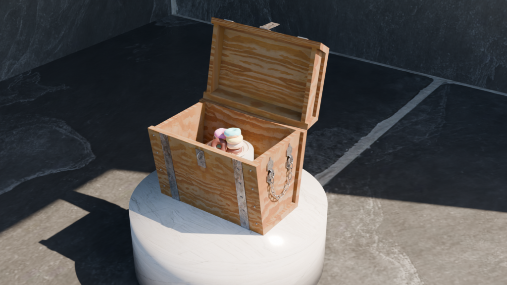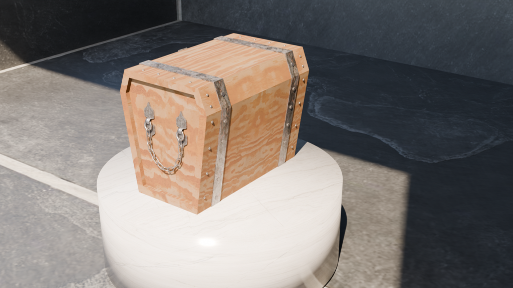 I rendered the treasure chest in a square room with one window in the wall. For some of the screenshots, I added an additional window to get more light for some of the smaller details.
